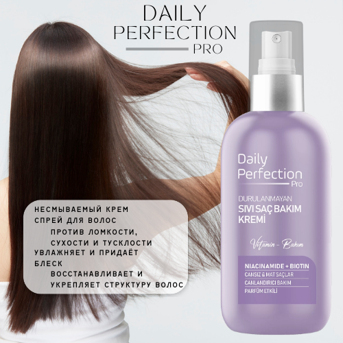 Daily Perfection Pro – несмываемый крем-спрей для волос Витаминный уход для безжизненных и тусклых волосСкажите "прощай" ломкости, сухости и тусклости!Daily Perfection Pro с ниацинамидом и биотином — это мгновенное восстановление и питание волос без утяжеления.Лёгкая текстура крем-спрея глубоко увлажняет, придаёт блеск и облегчает расчёсывание. А приятный парфюмированный аромат подарит ощущение свежести на весь день. Преимущества:• Восстанавливает структуру волос• Укрепляет и предотвращает ломкость• Подходит для ежедневного применения• Не требует смывания• Подходит для всех типов волос Объём: 200 мл Аромат: Парфюмированный Страна производства: Турция Верните своим волосам жизнь и сияние — оформите заказ на Kaspi прямо сейчас!
