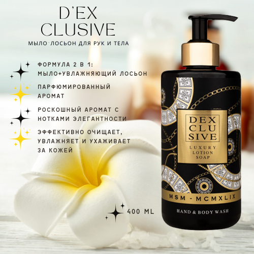 Погрузитесь в мир роскоши с мылом-лосьоном DEXCLUSIVE! Изысканный аромат и бережный уход делают это средство незаменимым элементом вашего ежедневного ритуала красоты.